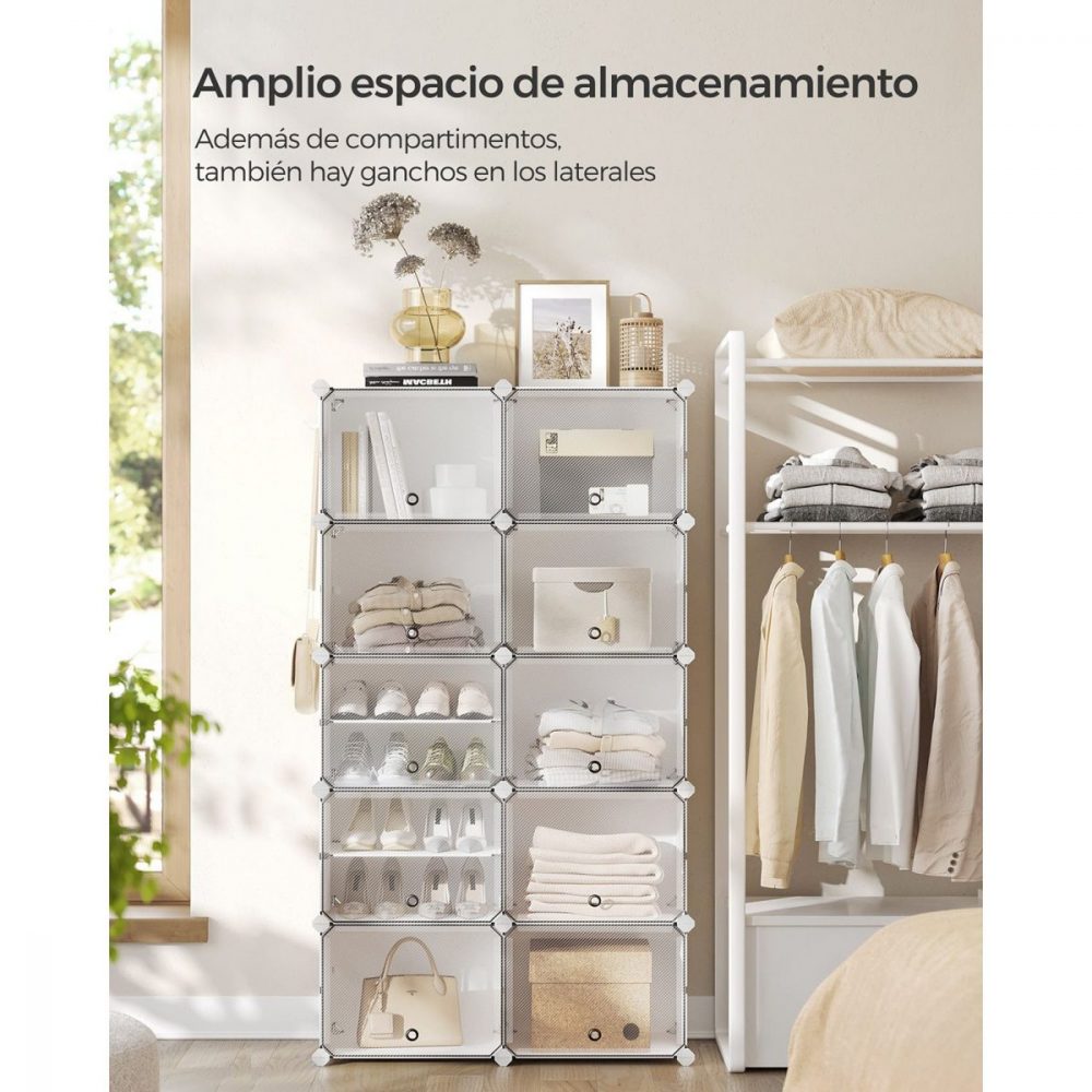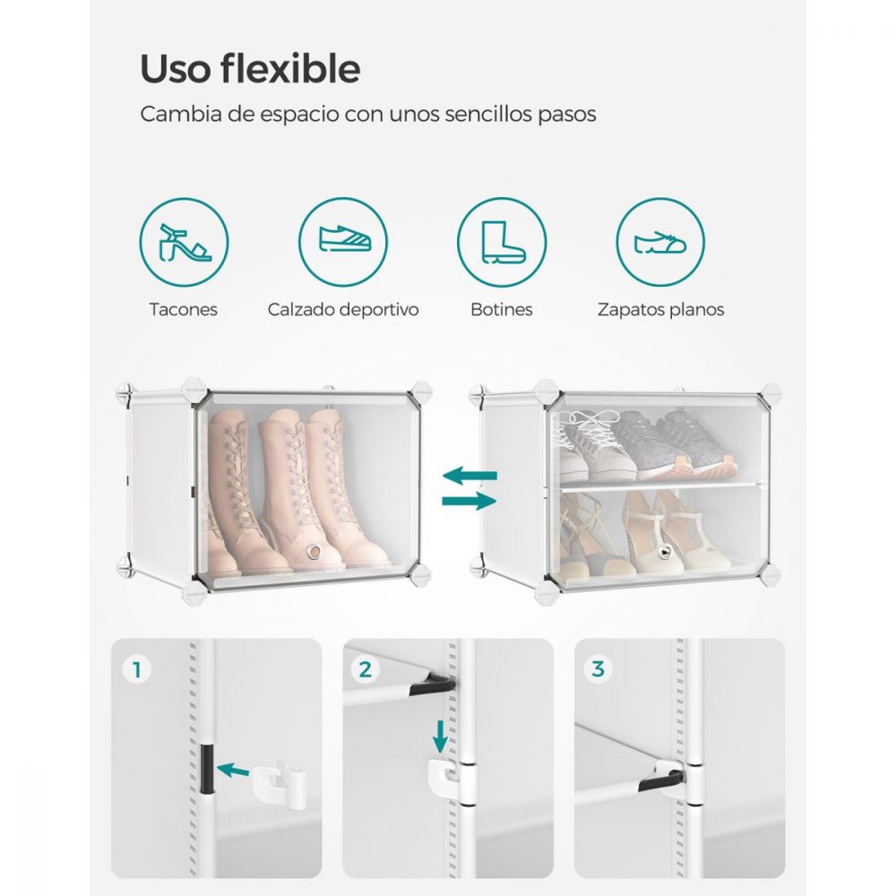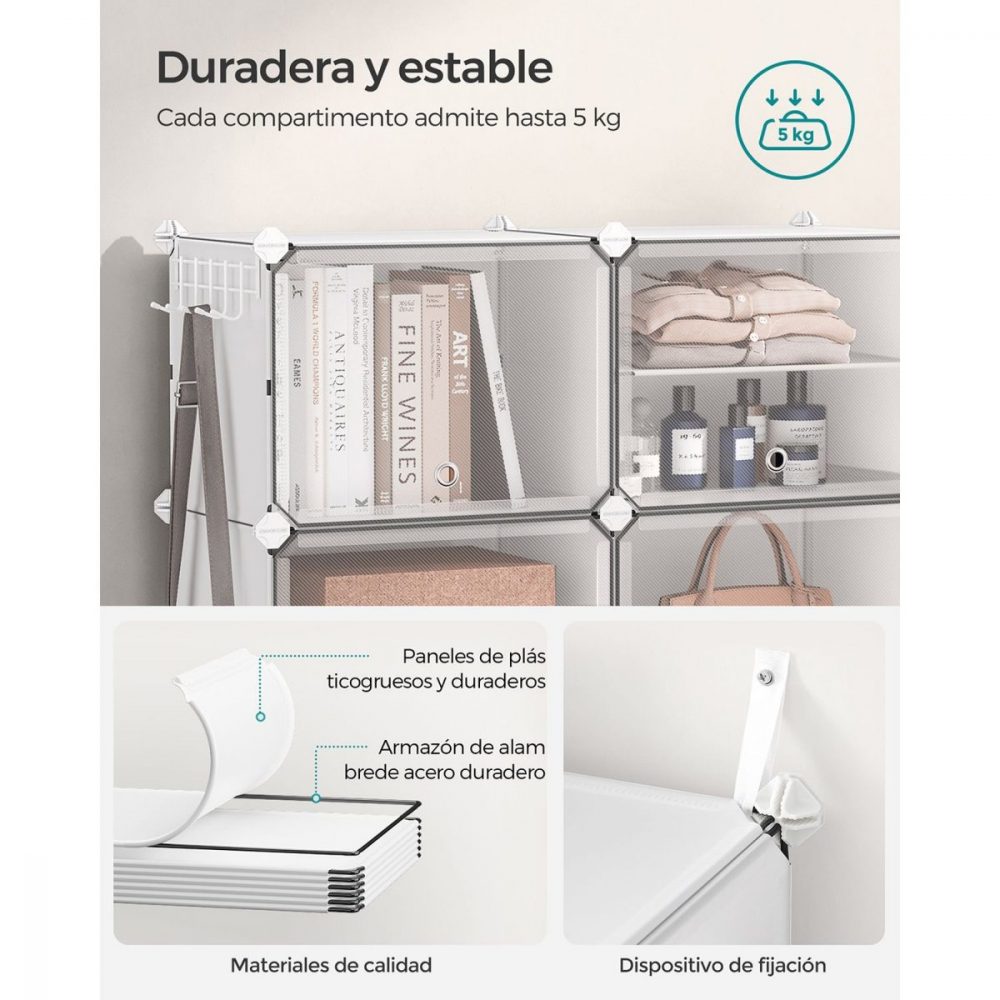 Robusto y Seguro: Fabricado con paneles de plástico de alta calidad y una estructura de alambre de acero, cada compartimento puede soportar hasta 5 kg. Incluye un kit antivuelco para asegurar su estabilidad en cualquier área de tu hogar, desde el salón hasta el dormitorio.
